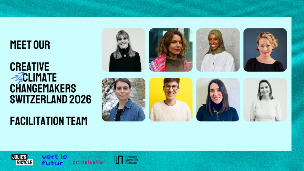 CCC Switzerland will be delivered in 2026 by Julie’s Bicycle in partnership with Vert le Futur, initiated and funded by the Swiss Arts Council, Pro Helvetia and Stiftung Mercator Schweiz.