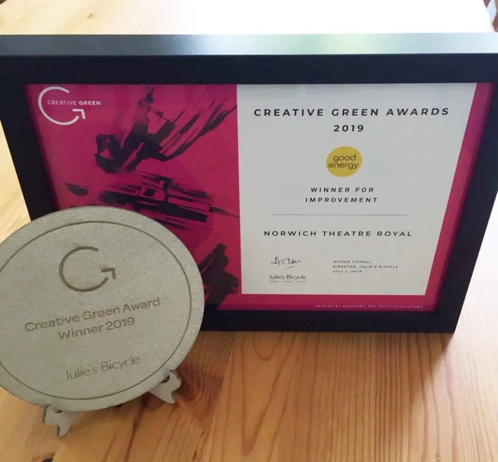 Norwich Theatre Royal has been demonstrating its environmental commitment for over 10 years, achieving impressive reductions such as a 77% reduction in energy use per performance and a 79% reduction in waste to landfill. Beyond their building and operations, they also have a range of internal and external engagement measures, from an environmental Open Day for visitors to commissioning a local artist to create an art installation made from recycled and reused materials. In 2019 they produced a video on their collaboration with New Adventures, featuring the New Adventures Green Champions. The theatre has been Creative Green certified for the last nine years. They won the 2019 Creative Green Award for Best Improvement, and went on to achieve a five-star Creative Green rating for the first time.