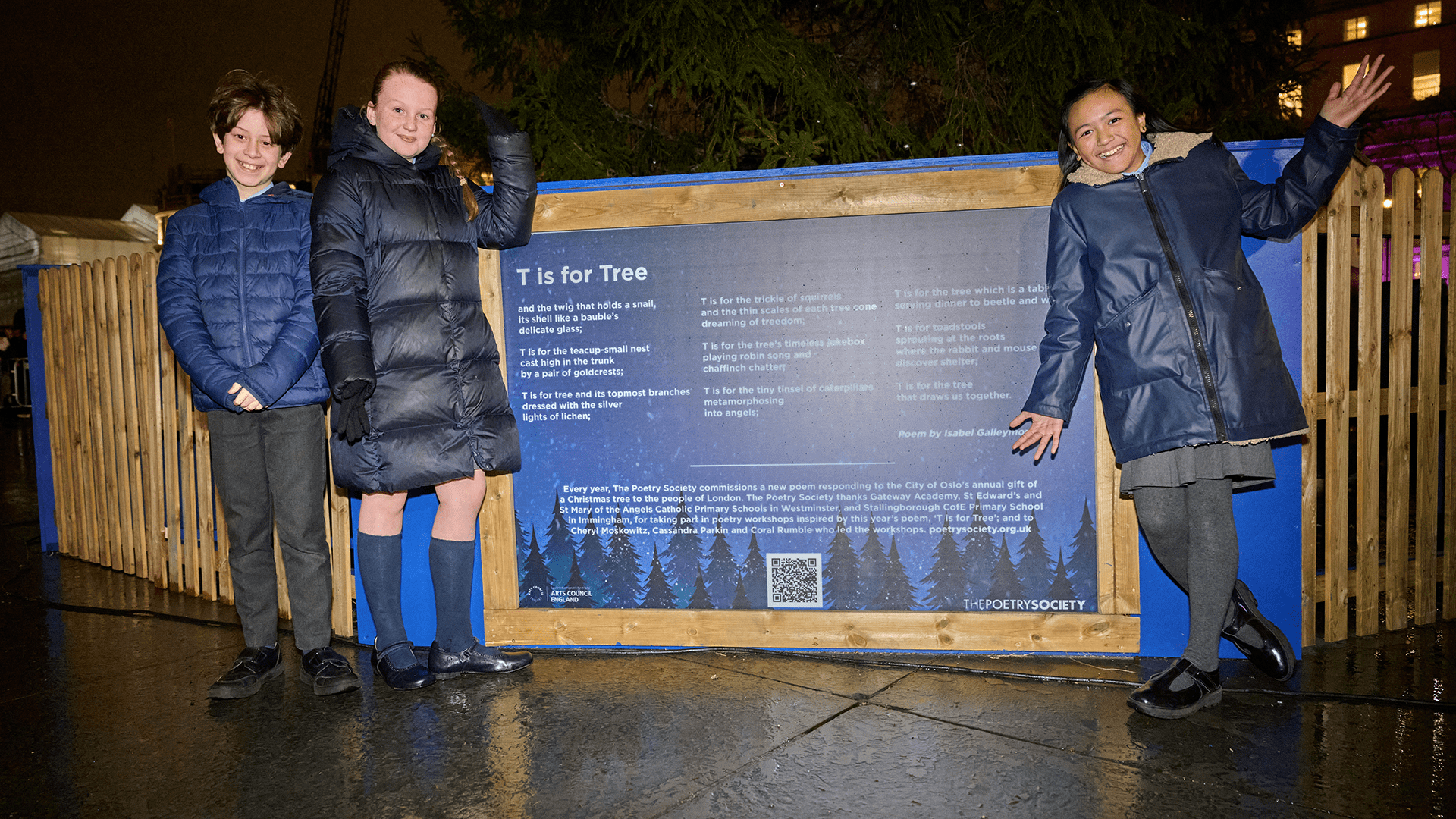 The Poetry Society champions poetry for all ages, and it’s a characteristic of our approach that we like to bring adult commissions and young people’s writing together in the same events, sharing one stage, just as we share one planet. To round off each year, we commission an annual poem for the lighting-up ceremony of the Christmas Tree in London’s Trafalgar Square, where it’s seen by an estimated 3 million people. Our commission for 2023 was written by poet Isabel Galleymore and performed by local children who’d been writing their own poems, in a joyful collective celebration of trees: “T is for the tree / that draws us together.”